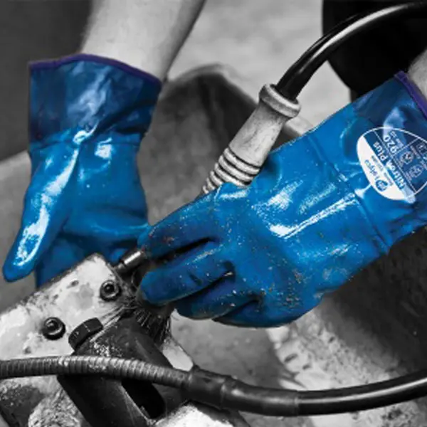 دستکش کار با مواد نفتی :دستکش کار با مواد نفتی بسیار گوناگون است که هر کدام در خصوص کار و فعالیت خاص تولید میشود دستکشهای ضد حلال به دلیل داشتن روکشی از جنس لاتکس در برابر نفوذ و خوردگی ناشی از کار با حلالها مقاوم است و برای استفاده در صنایع شیمیایی،پالایشگاههای نفت صنایع مواد غذایی، رنگ و چاپ ،صنایع خودروسازی مناسب است.
