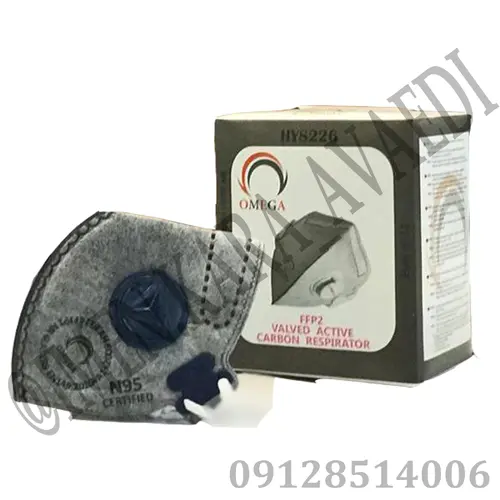 ماسک فیلتر دار امگا سوپاپ دار طوسی (OMEGA FFP2-N95)، شش لایه (یک لایه کربن ایرانی، یک لایه ملت بلون، چهار لایه اسپان)، سوپاپ تنفسی، کش مقاوم، عایق بینی، نمد ضدحساسیت، عرضه تکی، جین ۱۲ تایی و کارتن ۲۴۰ تایی